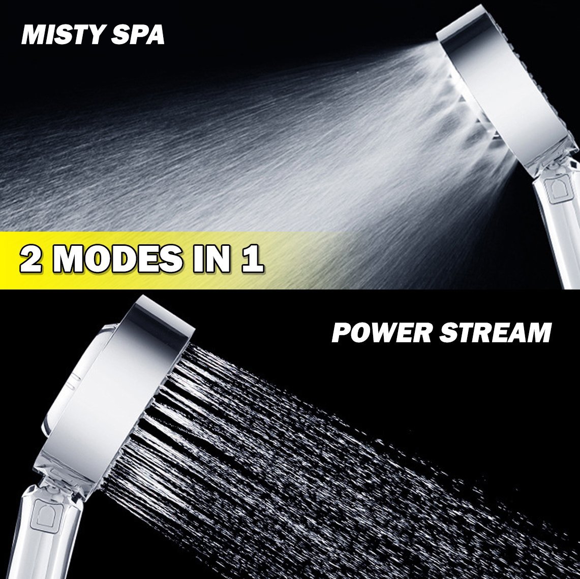 - Double Sided Design: Power Stream and Misty Spa - for your comforting experience. Simply adjust the mode by push-pull the head and pause it by vertical direction.